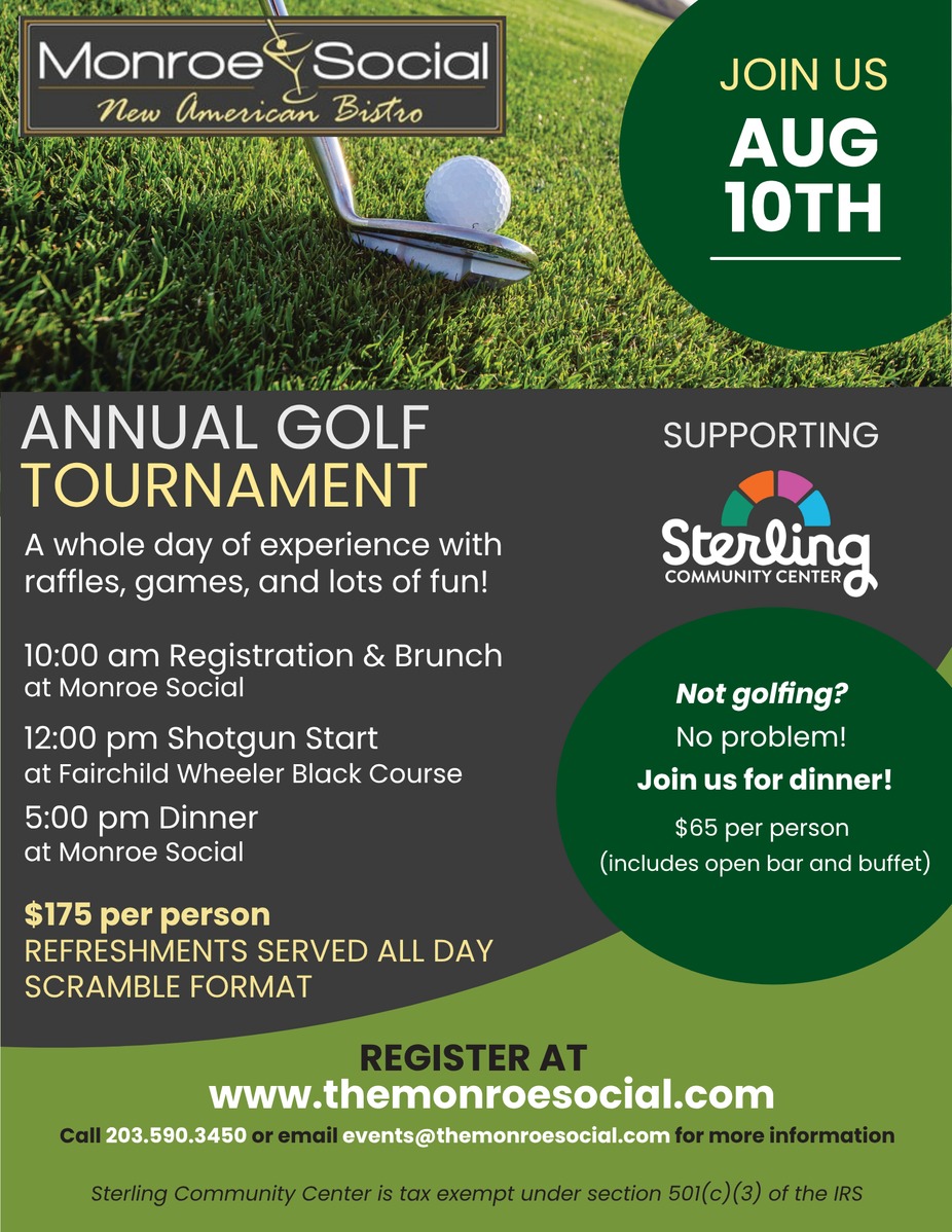 Join us for a fun day of golfing and feel good about helping those in need. All proceeds will be donated to the Sterling Community Center in Stratford. Call or contact us for more details. Register by buying tickets online, Venmo @monroe-social or give us a call at 203-590-3450. See you soon!
